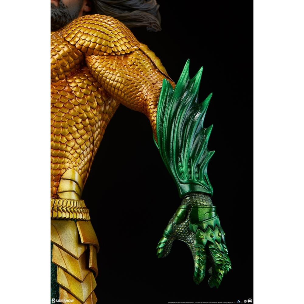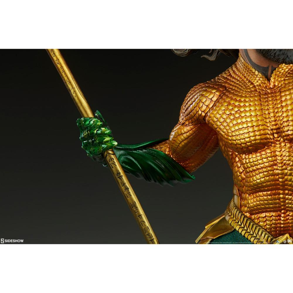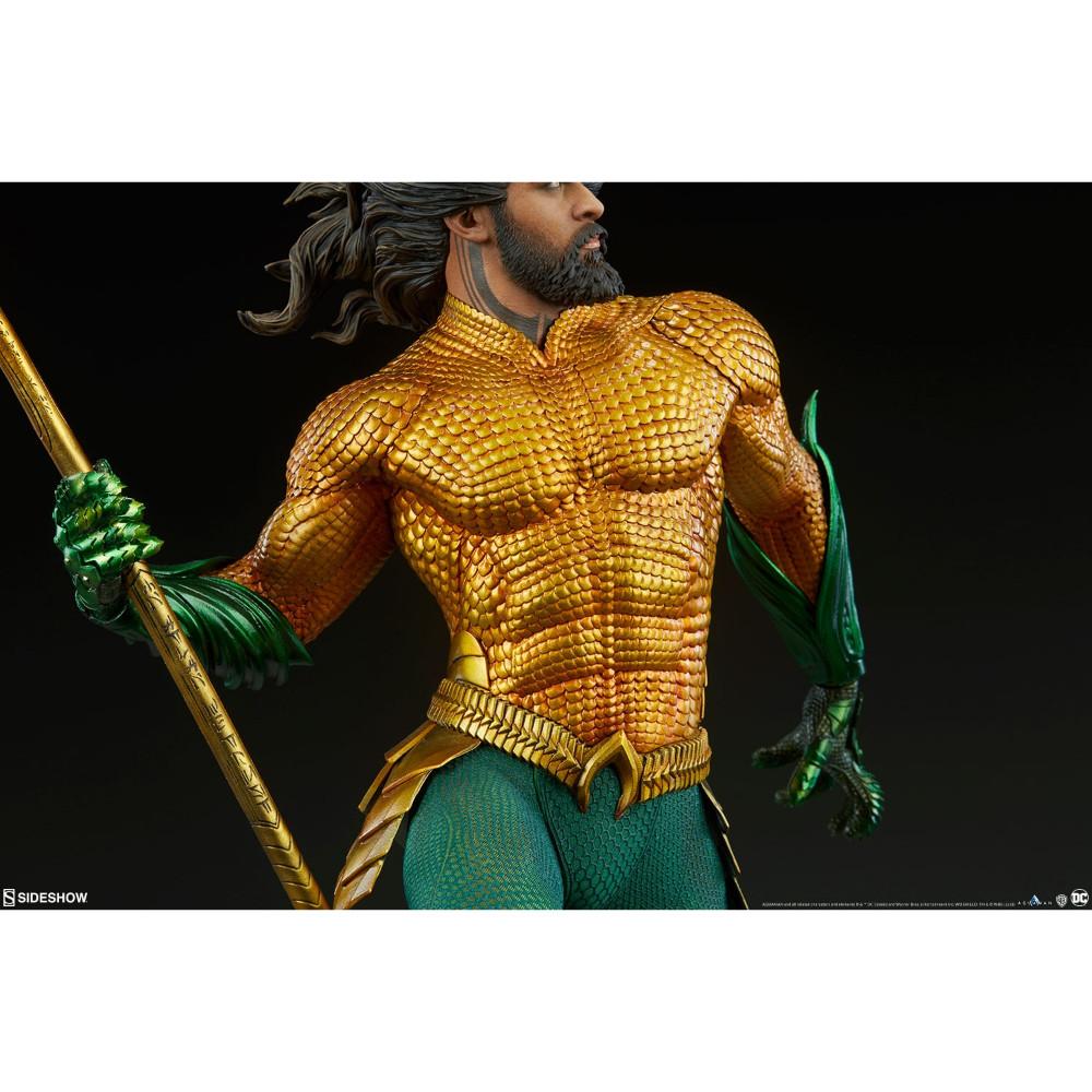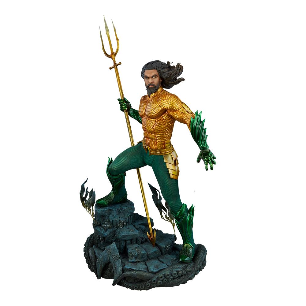 The Aquaman Premium Format figure measures 25" tall, capturing the majesty of the aquatic DC Comics hero as he appears on the silver screen. Painstakingly sculpted based on Jason Momoa's likeness from the film, his lifelike portrait features golden eyes and flowing hair to represent his heroic undersea presence.