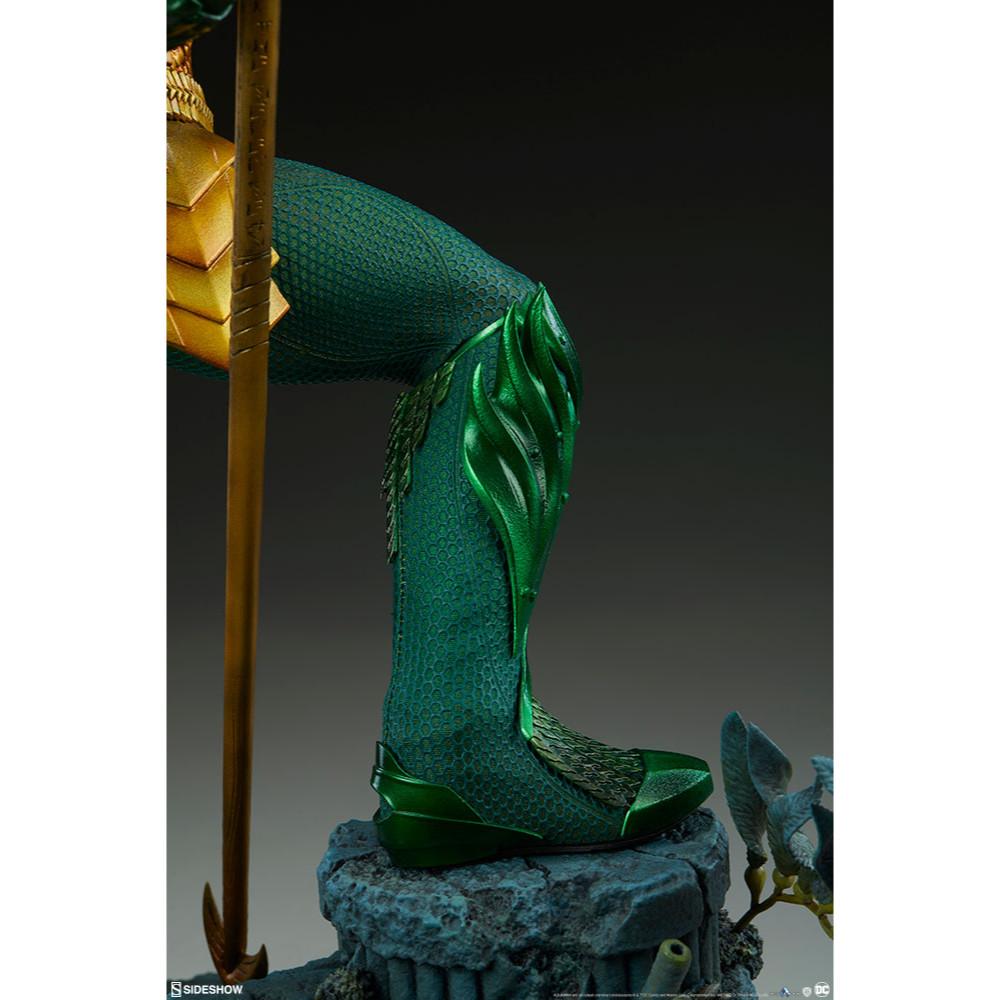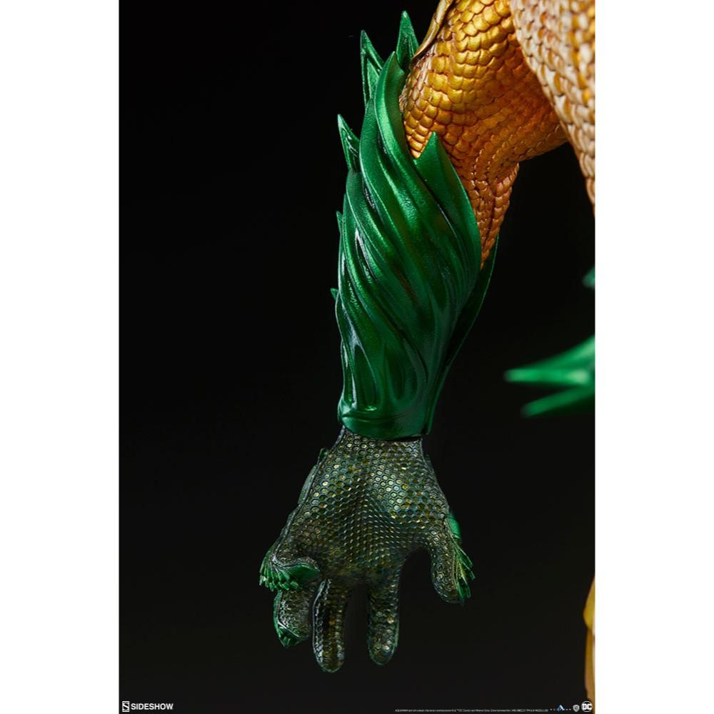 The Aquaman Premium Format figure features an orange metallic suit sculpted with incredibly detailed scale armor, paired with sculpted green metallic gloves and leg armor. In his right hand, Aquaman clutches a shining golden trident intricately inscribed with Atlantean text, and at his hips sculpted golden tassets and a belt add to Arthur Curry's battle-readiness. The figure also wears textured green fabric pants and boot elements carefully tailored to complete the costume inspired by Aquaman's most iconic, colorful look.