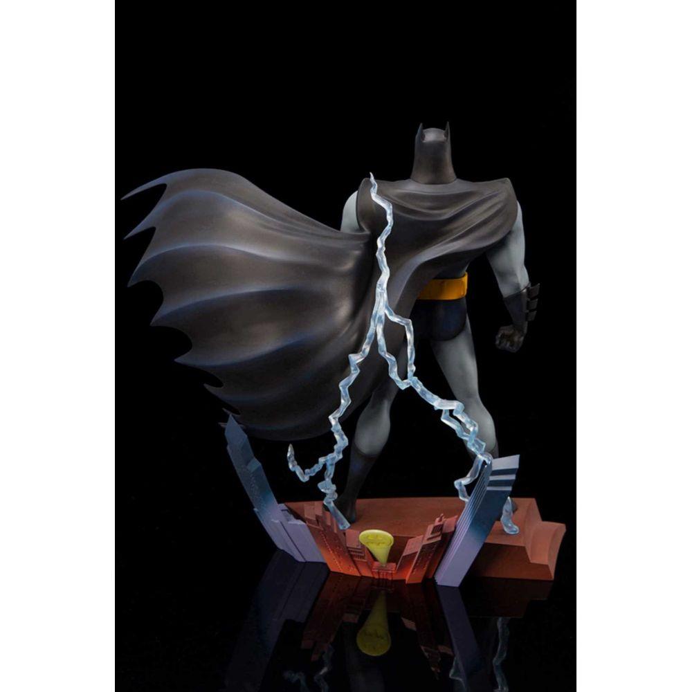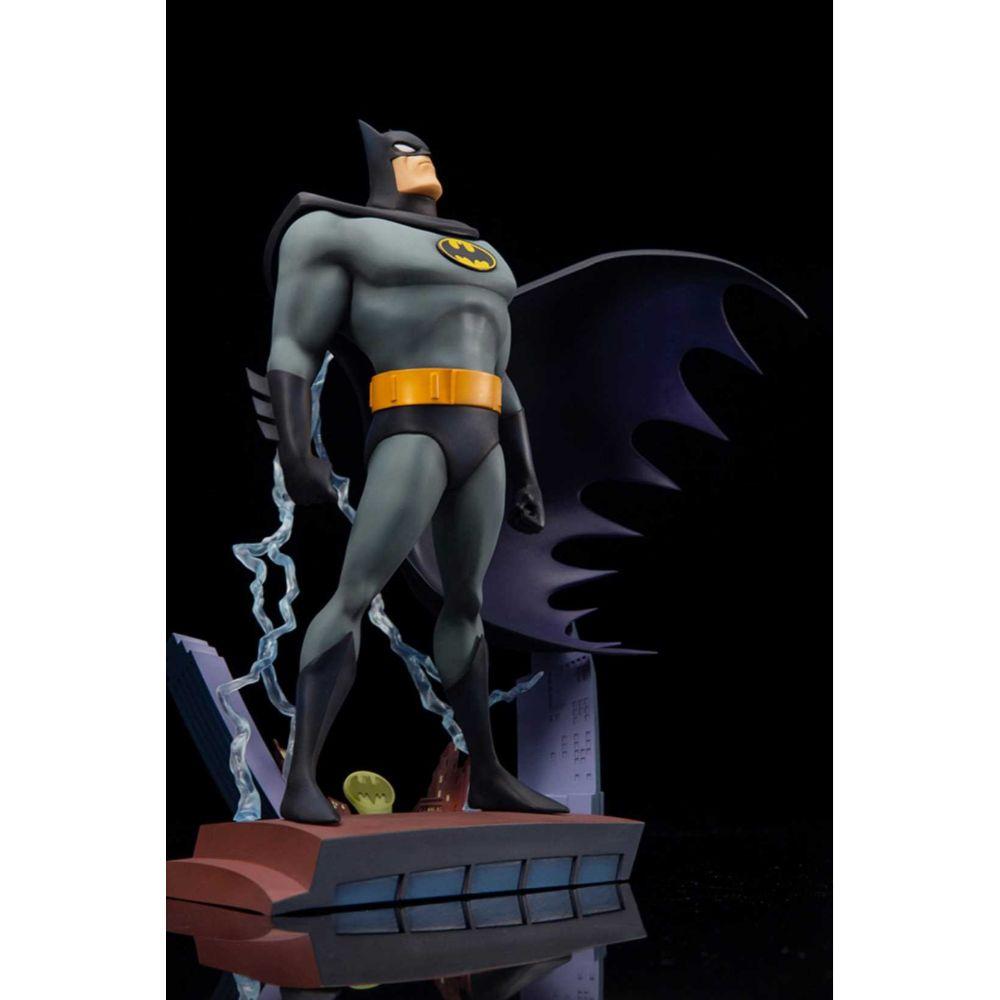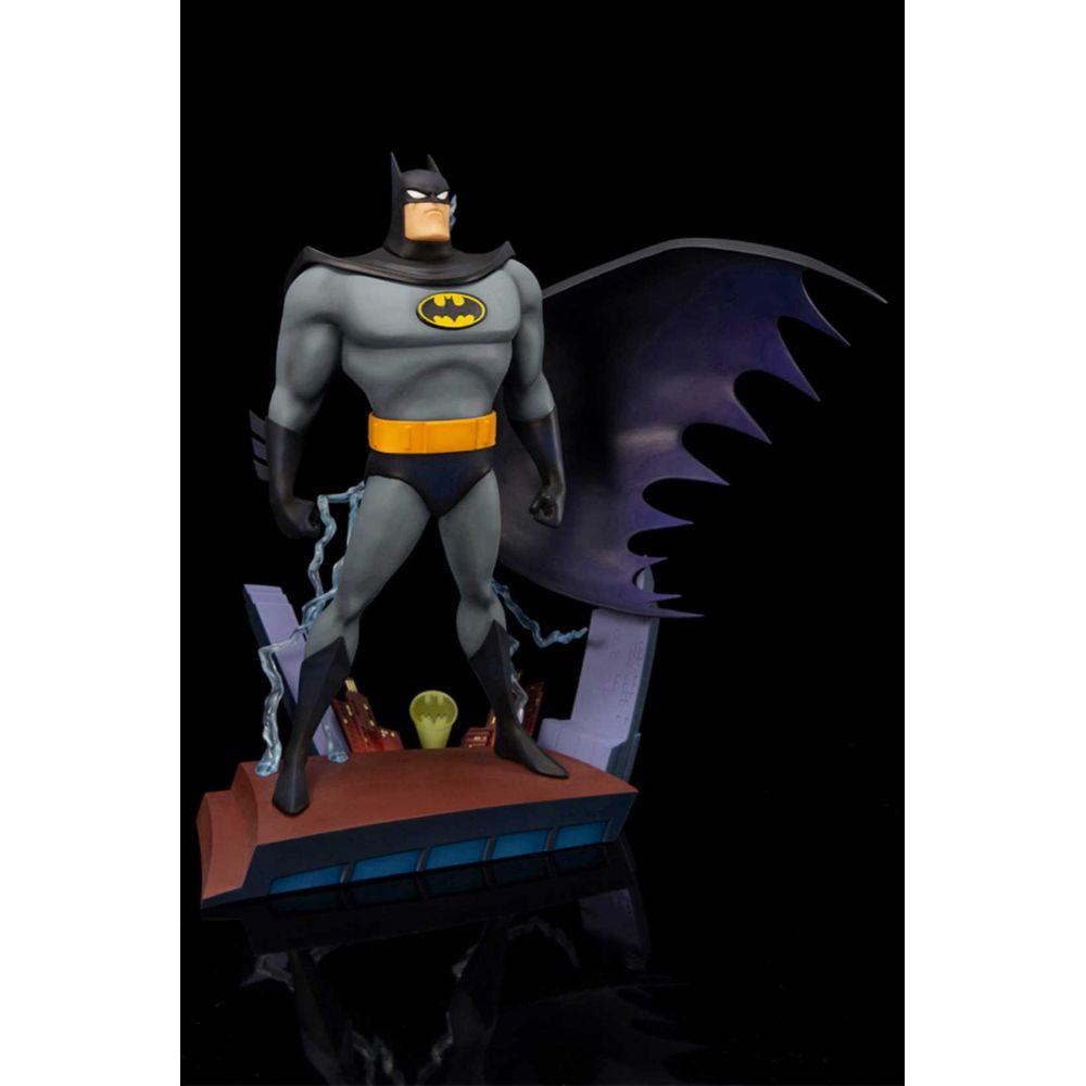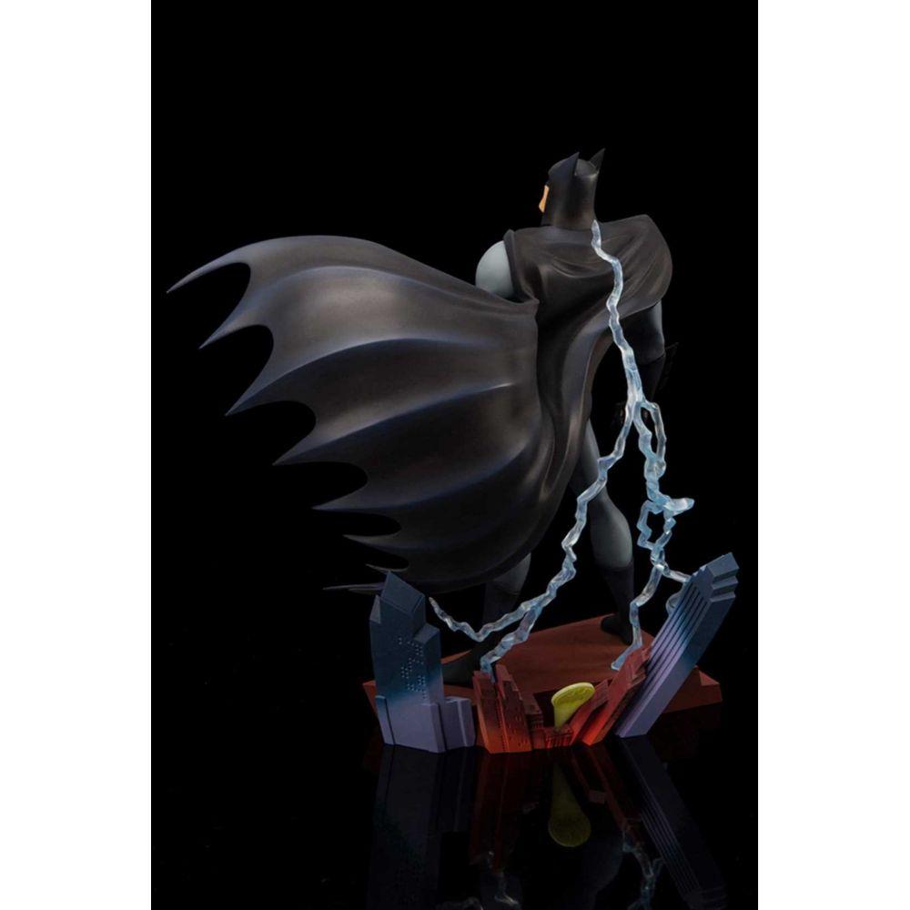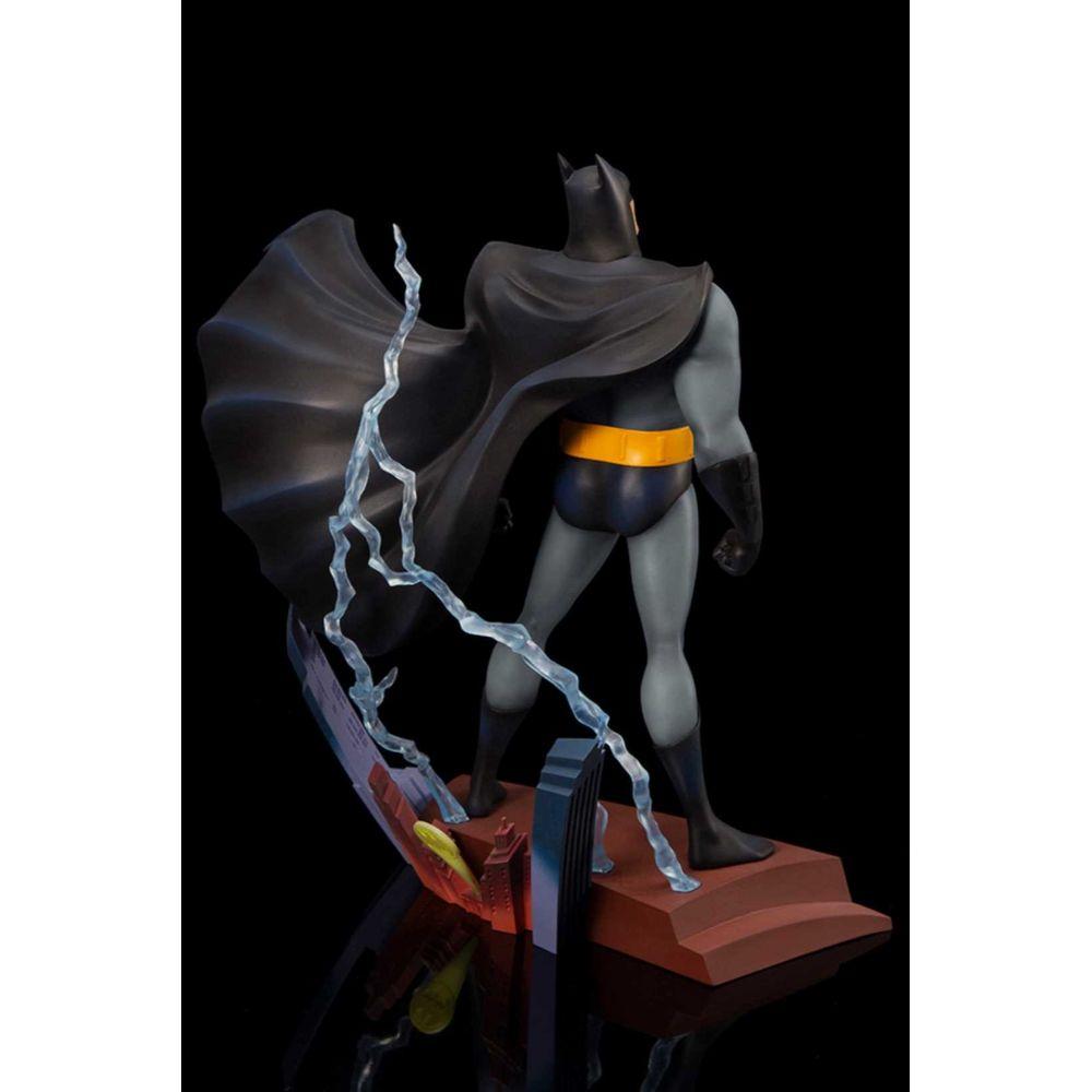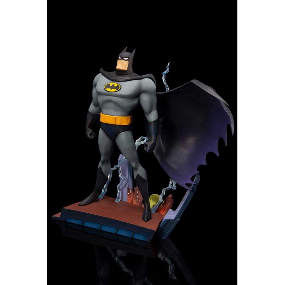 The statue's design is based on the iconic title sequence of the series, when the Dark Knight appears on a rooftop in Gotham City with a bold flash of lightning. The vignette style base resembles the skyline of Gotham City, with a sculpted Bat-Signal shining against the nighttime scenery and three-dimensional electricity effect parts that give the statue an atmospheric appearance.