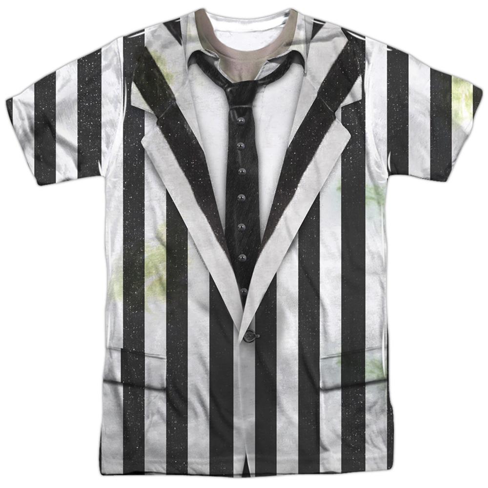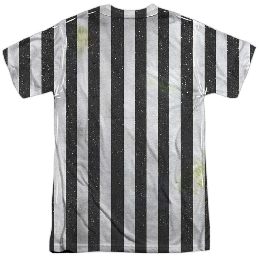 Be the ghost with the most, babe, with this sublimated t-shirt based on the bio-exorcist's iconic black and white striped suit. This t-shirt is hand-printed using a dye sublimation printing process that creates slight imperfections over seams and/or folds and are unique to and a part of each t-shirt. 100% polyester.
