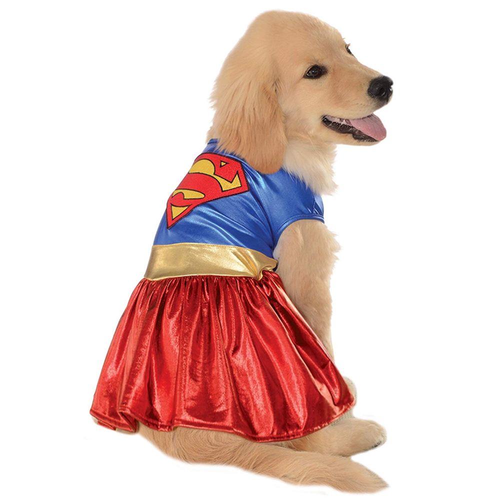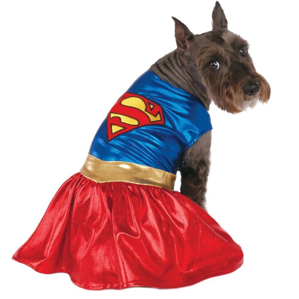 This Supergirl pet costume includes a shiny blue dress with red skirt and golden belt. Not all costumes fit all pets or breeds without adjustment. Do not select based on breed, consider costume style and animal shape before ordering.