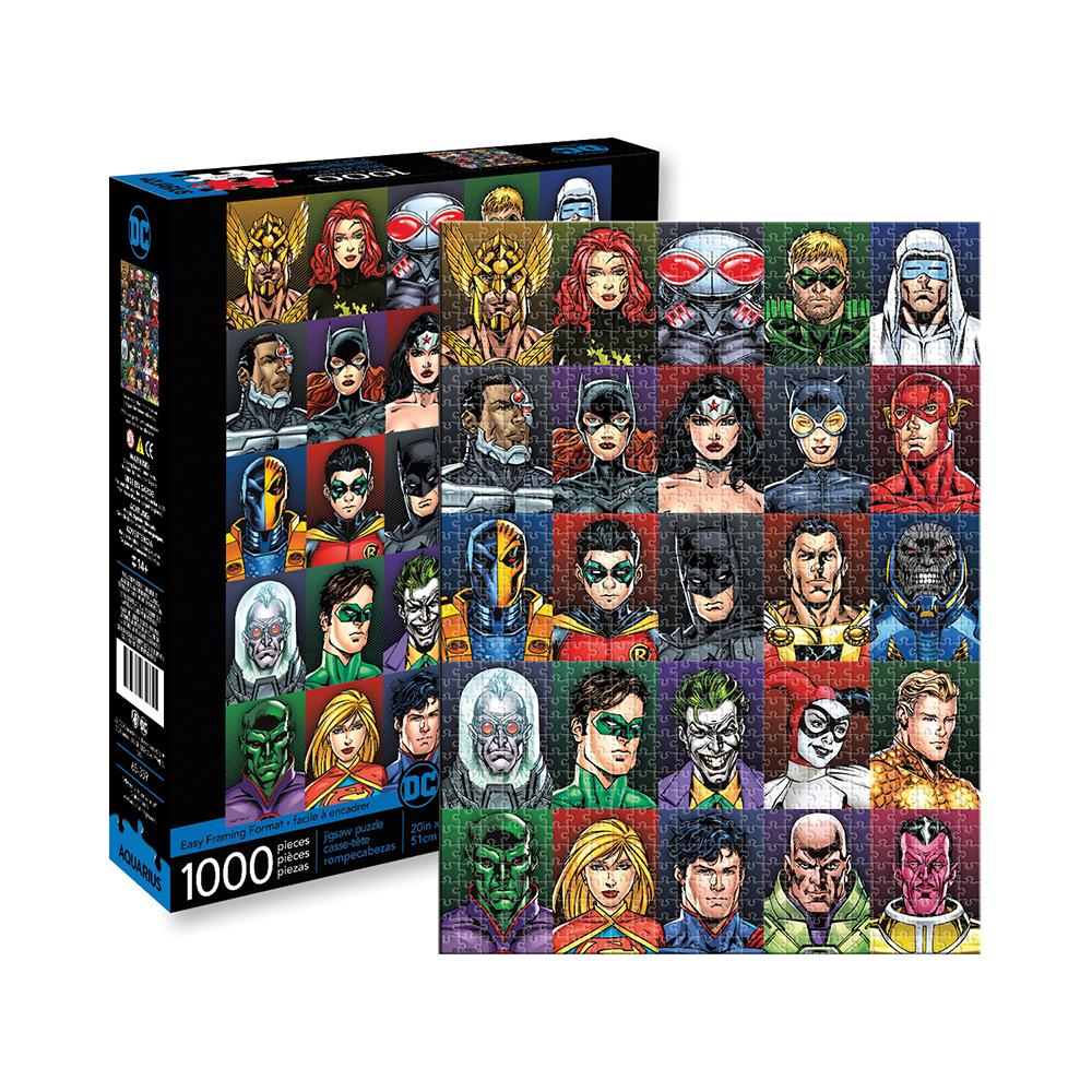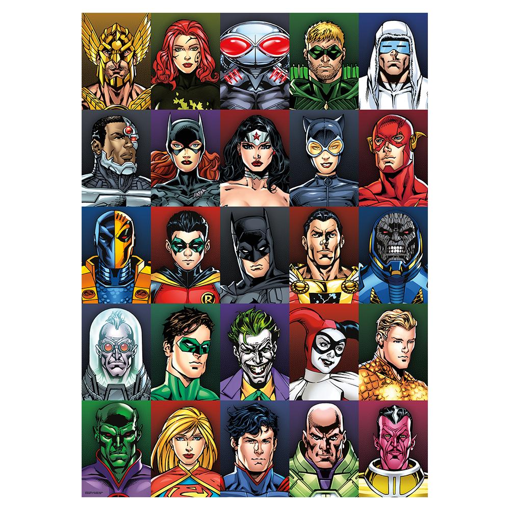 Piece together your favorite DC Comics characters with this 1000-piece jigsaw puzzle! This puzzle tests your comic book knowledge with twenty-five images of DC heroes and villains including Hawkman, Cyborg, Wonder Woman, Catwoman, Batman, the Joker, Green Lantern, Harley Quinn, Supergirl, Superman, Lex Luther, and more.
