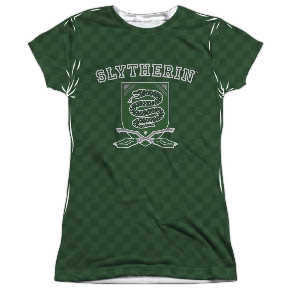 Which Quidditch team is your favorite? Show your support for Slytherin house. This juniors t-shirt is hand-printed using a dye sublimation printing process that creates slight imperfections over seams and/or folds and are unique to and a part of each t-shirt. 100% polyester.