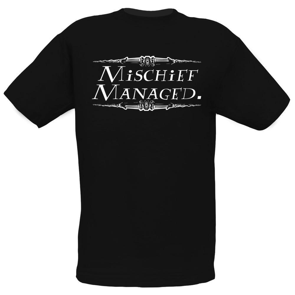 Selected by more than 25,000 fans in a world-wide poll, this Exclusive Harry Potter Mischief Managed™ t-shirt features the incantation used to hide the contents of Marauder's Map after they've been revealed. This 100% cotton black t-shirt with white lettering is available in youth, adult, and fitted junior's sizes. This is the adult shirt.