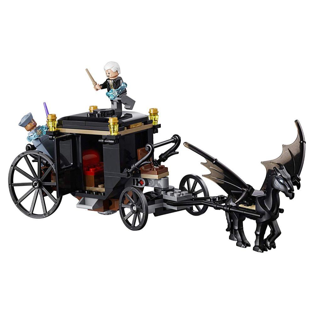 Enter a fantasy realm with LEGO®: Fantastic Beasts 75951 Grindelwald's Escape magical showdown between Seraphina Picquery and Grindelwald, featuring an articulated carriage with opening doors and removable roof attached to the Thestral figure with hinged wings. Use the shooting spell accessories to make the Fantastic Beasts: The Crimes of Grindelwald magic come alive and role-play a mighty battle. Includes 2 minifigures.