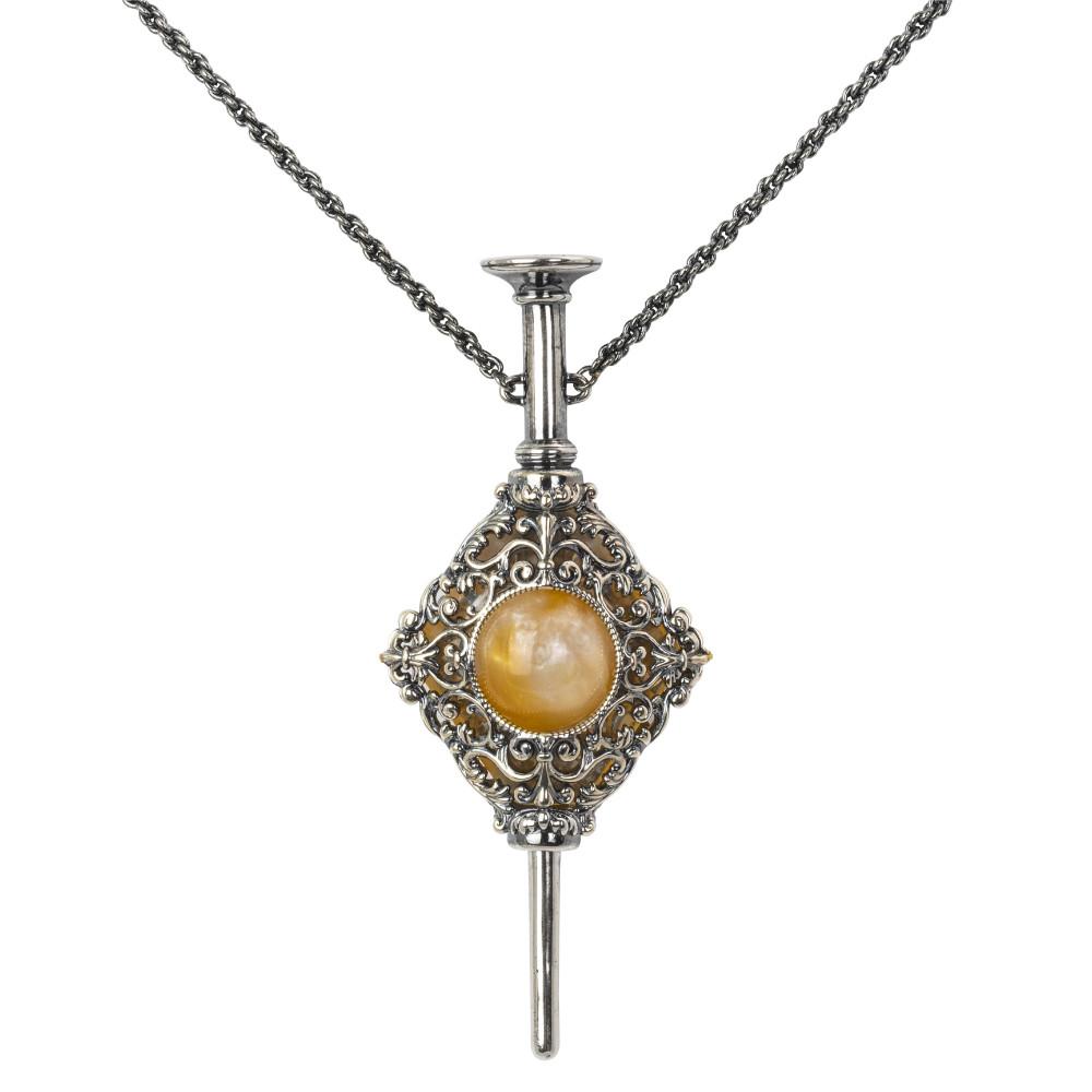With silver plating and intricate details, this is an authentic prop replica of Grindelwald's pendant as seen in the film. Pendant measures approximately 3 inches tall and includes a 26-inch chain.