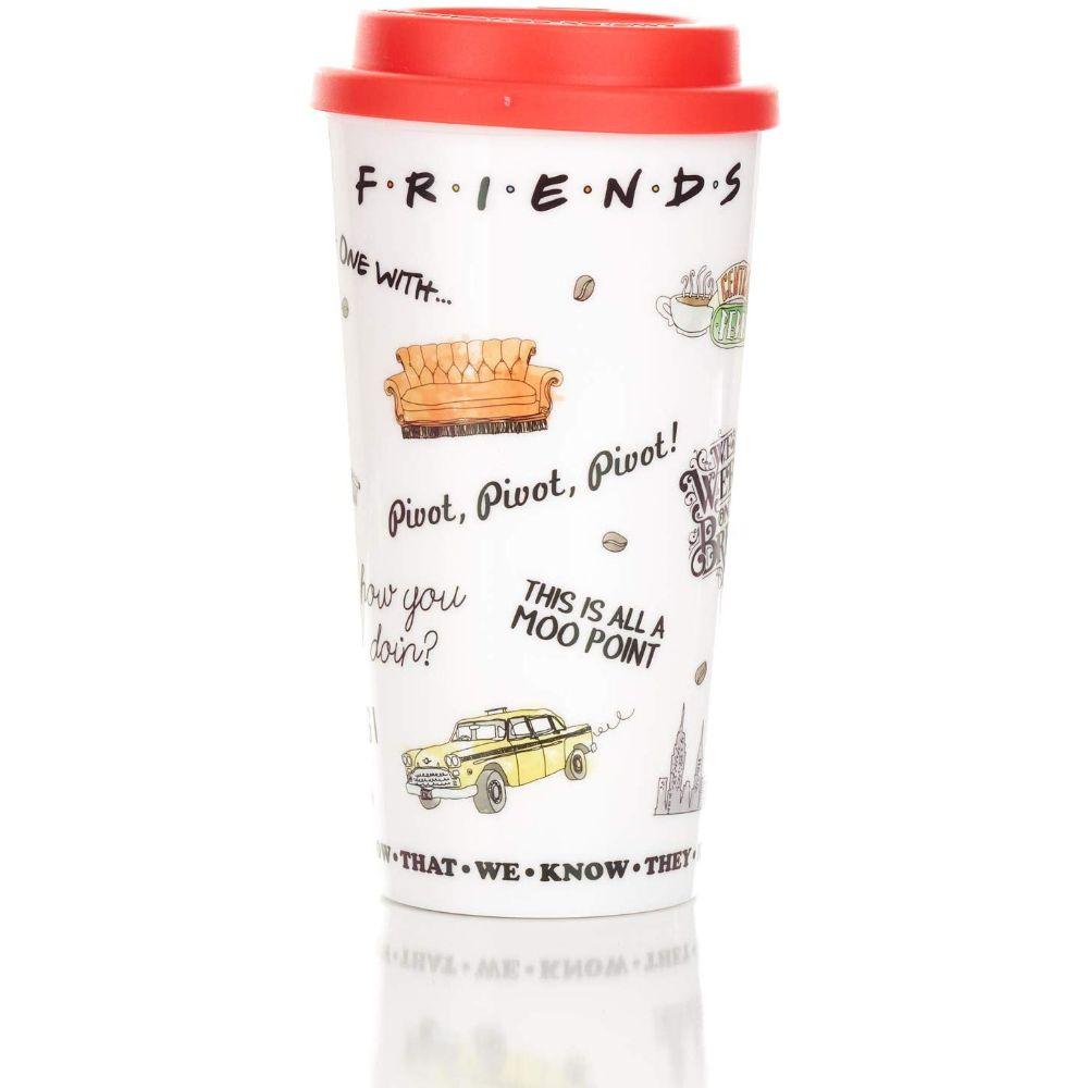 Whether you're on a busy train, a crowded bus, or at your desk at work, transport yourself to your favorite fictional coffee shop with this 16 oz. plastic Friends travel mug with plastic lid that features iconic quotes and images that is sure to make any fan of the series smile.