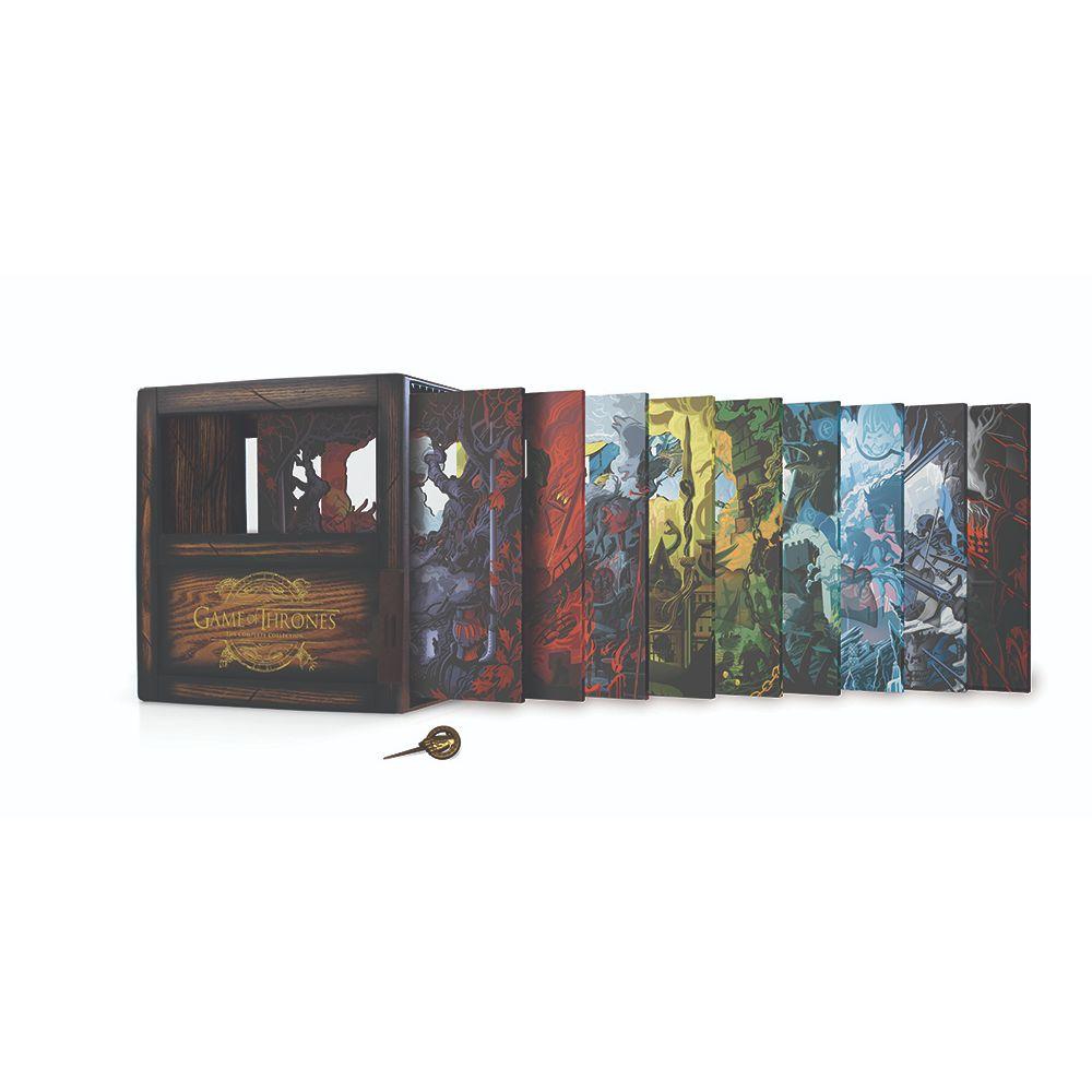 Game of Thrones: The Complete Collection is packaged in a visually stunning wooden shadow box case, featuring beautiful, multi-layered panel designs by Robert Ball (the artist behind the "Beautiful Death" series) that summarize the Game of Thrones story. Each season is represented by a different layer, showcasing iconic characters and memorable moments from the show, all clambering toward the Iron Throne. The set also contains a "Hand of the King" pin clasp, which holds all nine custom plated disc sleeves.