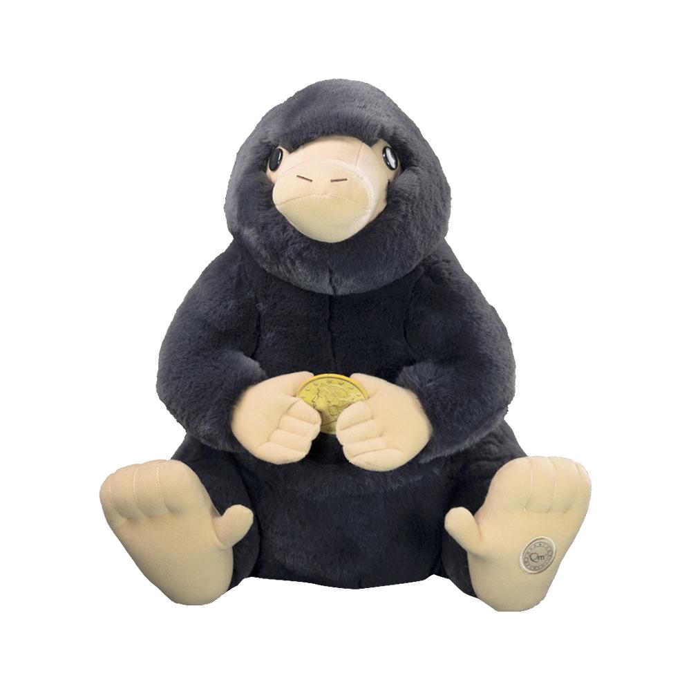 The QMx giant Niffler plush is absolutely enormous at 16 inches tall. He clutches a big golden coin and has a working pouch that's perfect for holding untold treasures or even a QMx plush baby Niffer! (Sold separately).