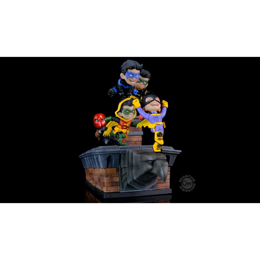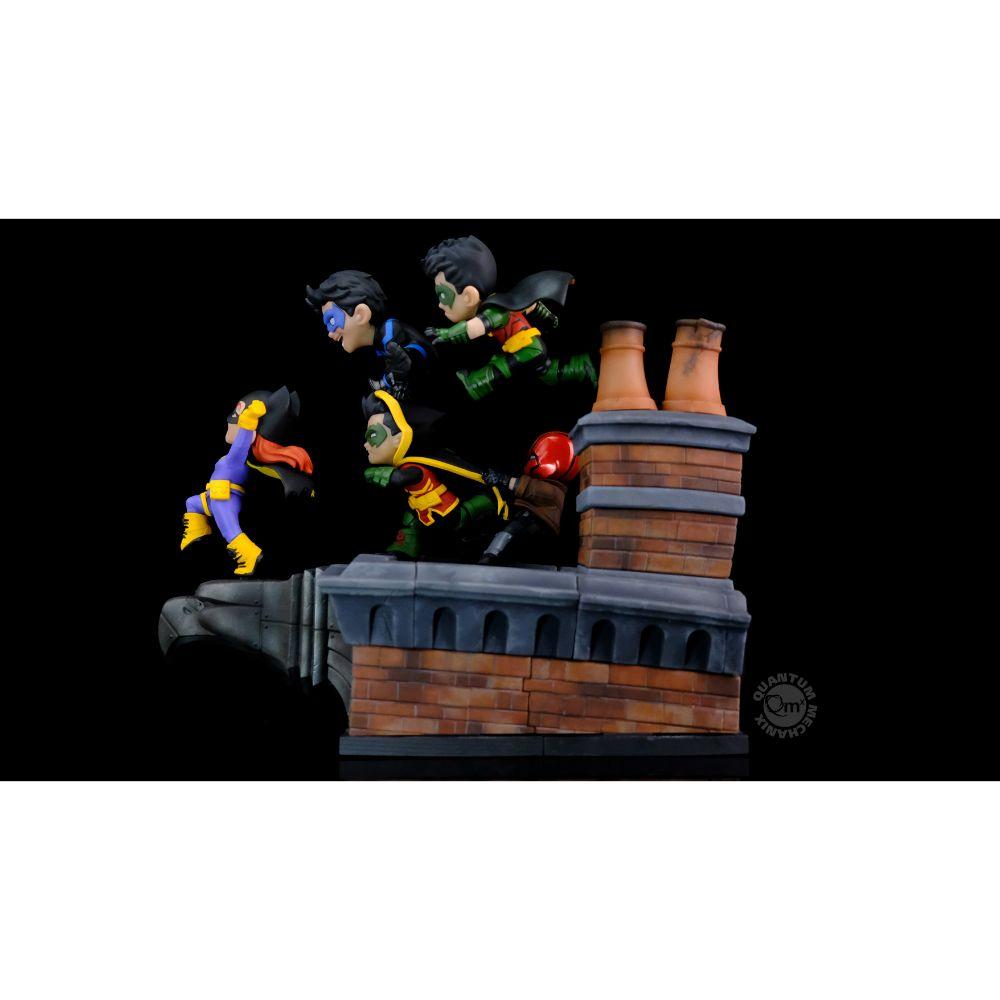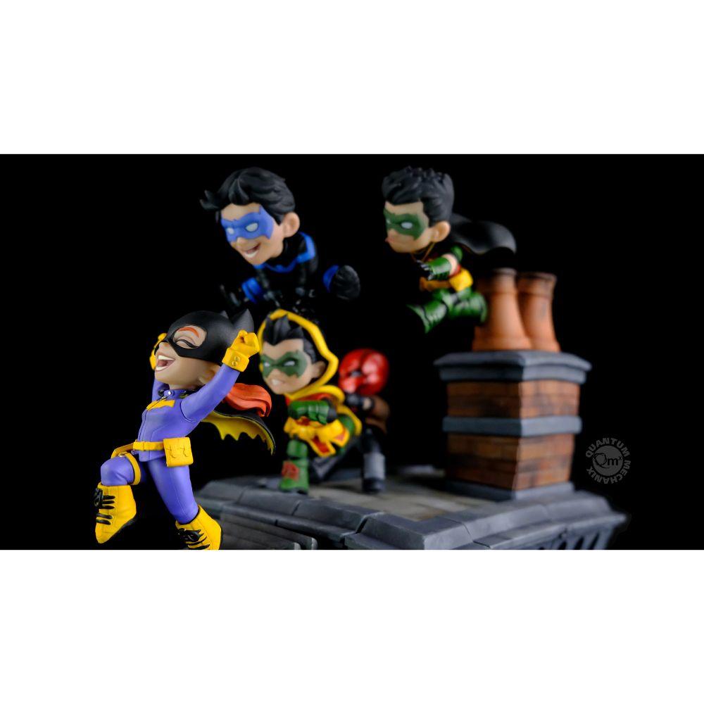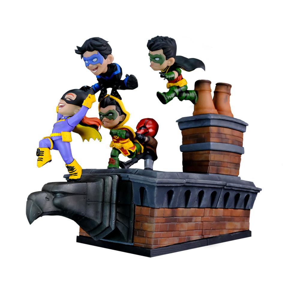 This Gotham rooftop Q-Master diorama features the Dark Knight's collective of Robins and Batgirl as they leap from chimney to chimney, enjoying the challenge of trying to beat one another as they race across the skyline. Tim Drake (Red Robin), Damian Wayne (Robin), Dick Grayson (Nightwing), and Barbara Gordon (Batgirl) are perfectly presented as they put their heroic skills to the test on a detailed rooftop setting. And, of course, Batgirl leads the pack, raising her arms in triumph at the roof's edge.