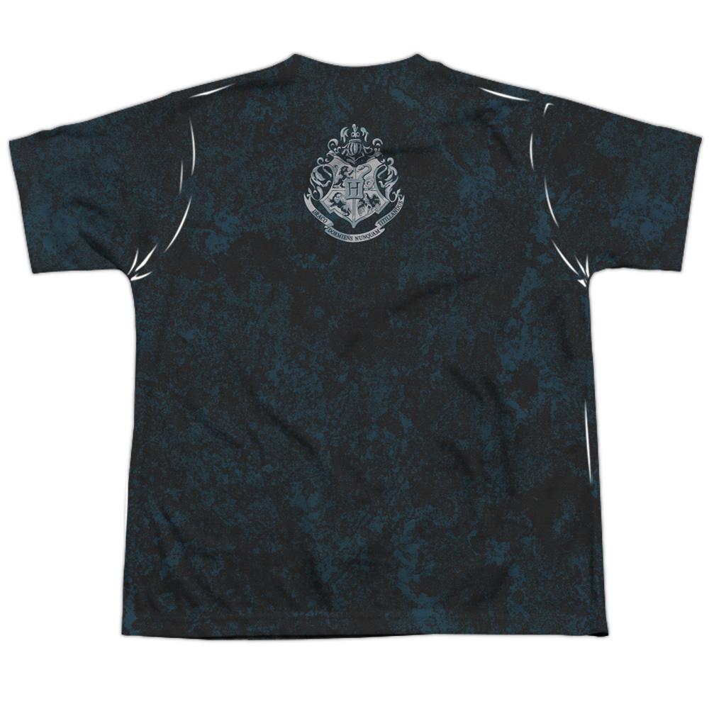 This sublimated youth t-shirt features a design of the poster of the first film, Harry Potter and the Sorcerer's Stone. This youth t-shirt is hand-printed using a dye sublimation printing process that creates slight imperfections over seams and/or folds and are unique to and a part of each t-shirt. 100% polyester.