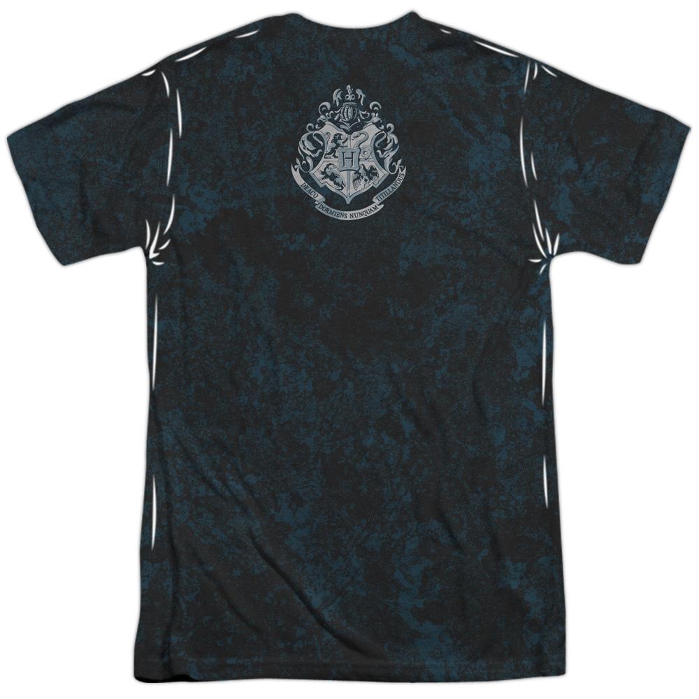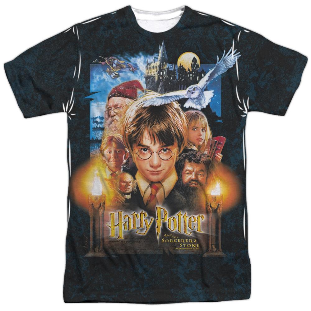 This sublimated t-shirt features a design of the poster of the first film, Harry Potter and the Sorcerer's Stone. This t-shirt is hand-printed using a dye sublimation printing process that creates slight imperfections over seams and/or folds and are unique to and a part of each t-shirt. 100% polyester.