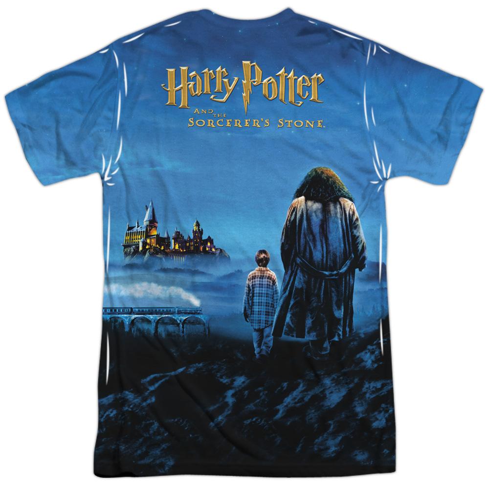 This sublimated t-shirt features a design of Harry, Ron, Hermione, and more, as seen in Harry Potter and the Sorcerer's Stone. This t-shirt is hand-printed using a dye sublimation printing process that creates slight imperfections over seams and/or folds and are unique to and a part of each t-shirt. 100% polyester.