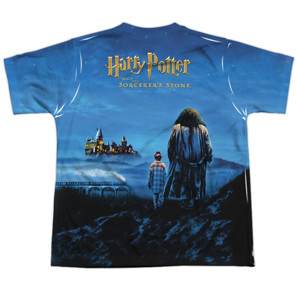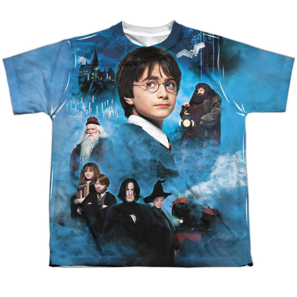 This sublimated youth t-shirt features a design of Harry, Ron, Hermione, and more, as seen in Harry Potter and the Sorcerer's Stone. This youth t-shirt is hand-printed using a dye sublimation printing process that creates slight imperfections over seams and/or folds and are unique to and a part of each t-shirt. 100% polyester.