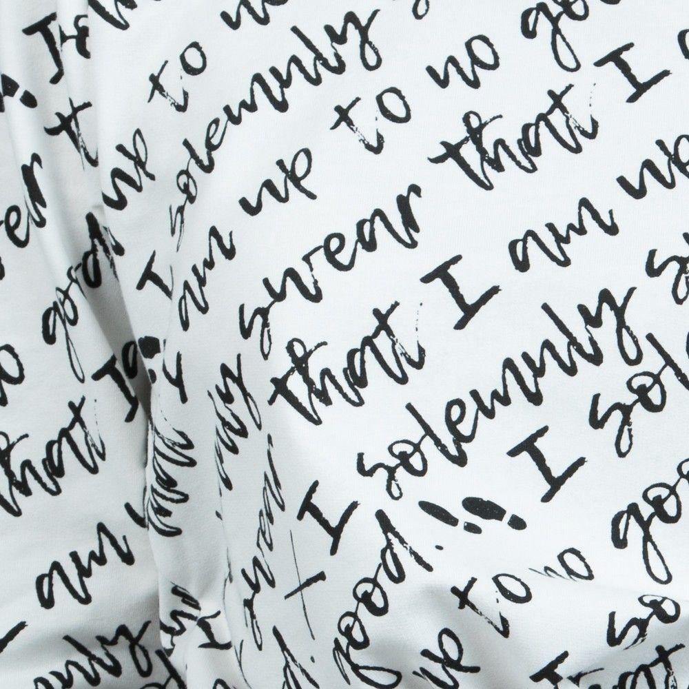 This cropped sweatshirt features an allover print design of the phrase "I solemnly swear that I am up to no good" and includes a front drawcord. 100% cotton French terry