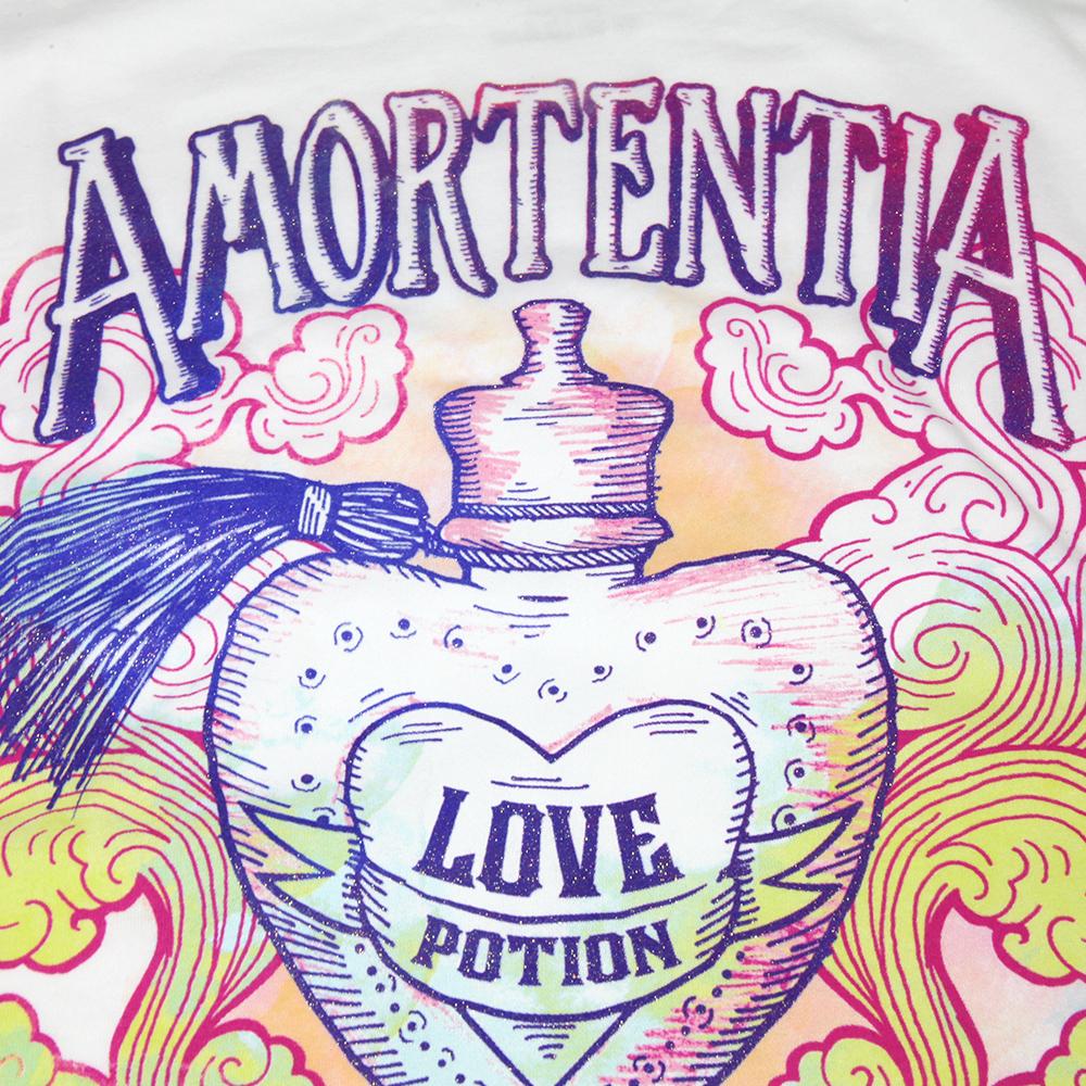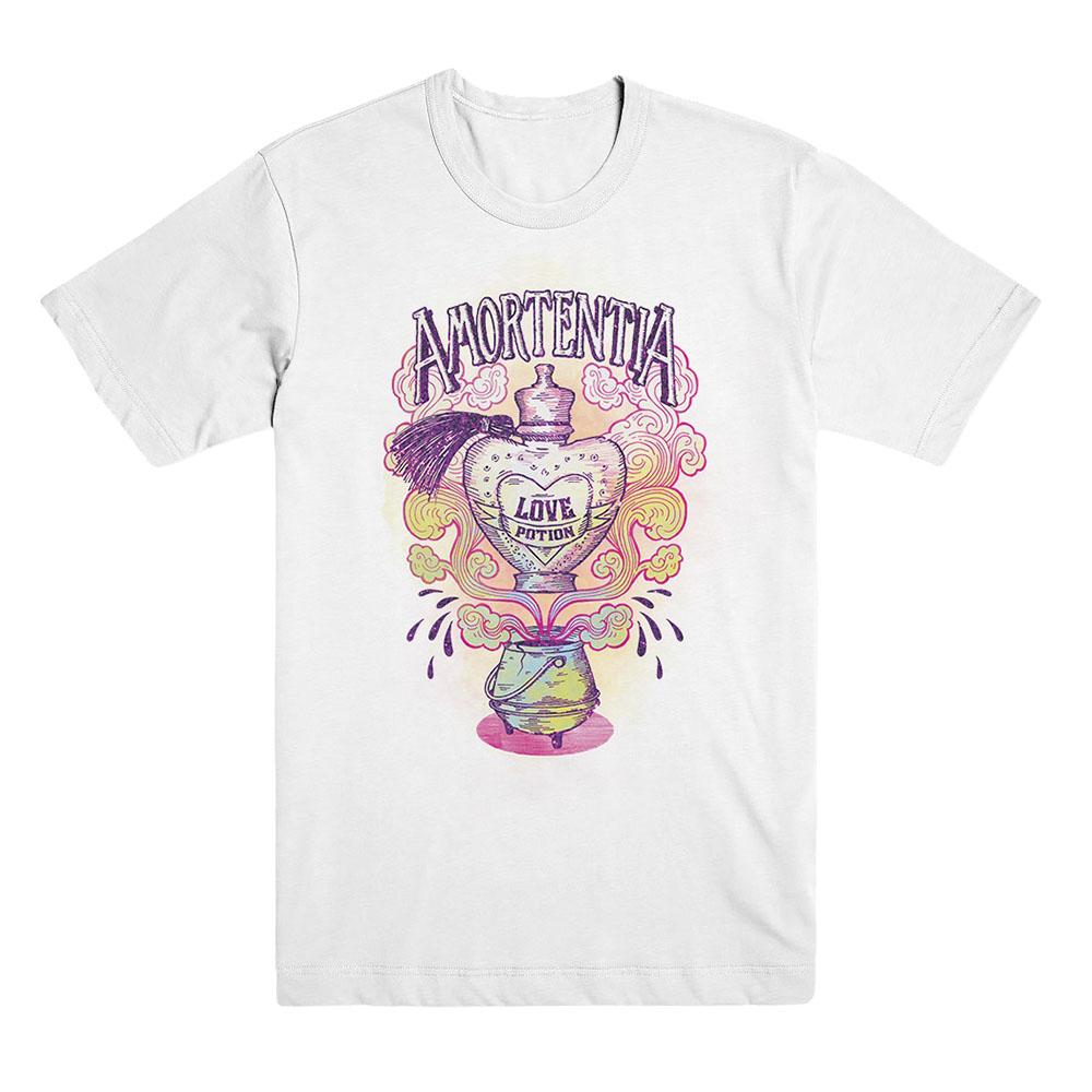 Our exclusive! Amortentia is the most powerful love potion in existence. It creates a different aroma for everyone who smells it, reminding each person of the things that attract them most. While this t-shirt has no scent to it, it is printed with a special Crystalina ink, which gives it a magical and glittery touch. 100% cotton.