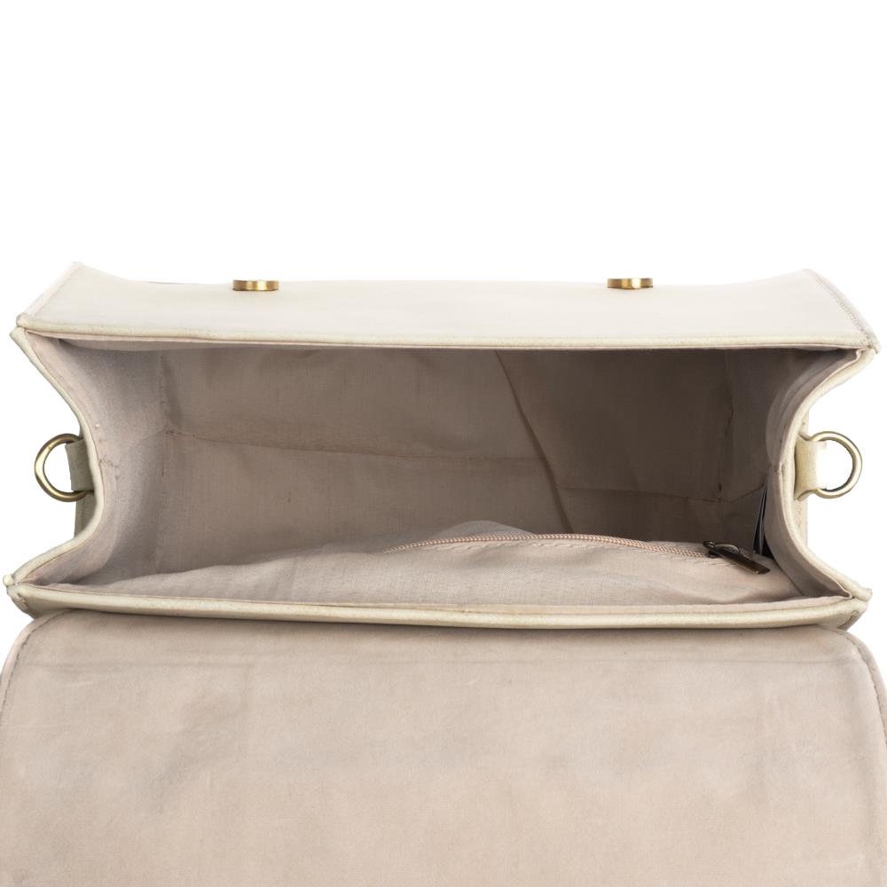 This ivory-colored bag features a magnetic snap closure, top handle, adjustable shoulder strap, and an interior zip pocket. Made of polyurethane and measures 9.5" W x 7.25" H x 4.5" D. Wipe clean with a damp cloth.