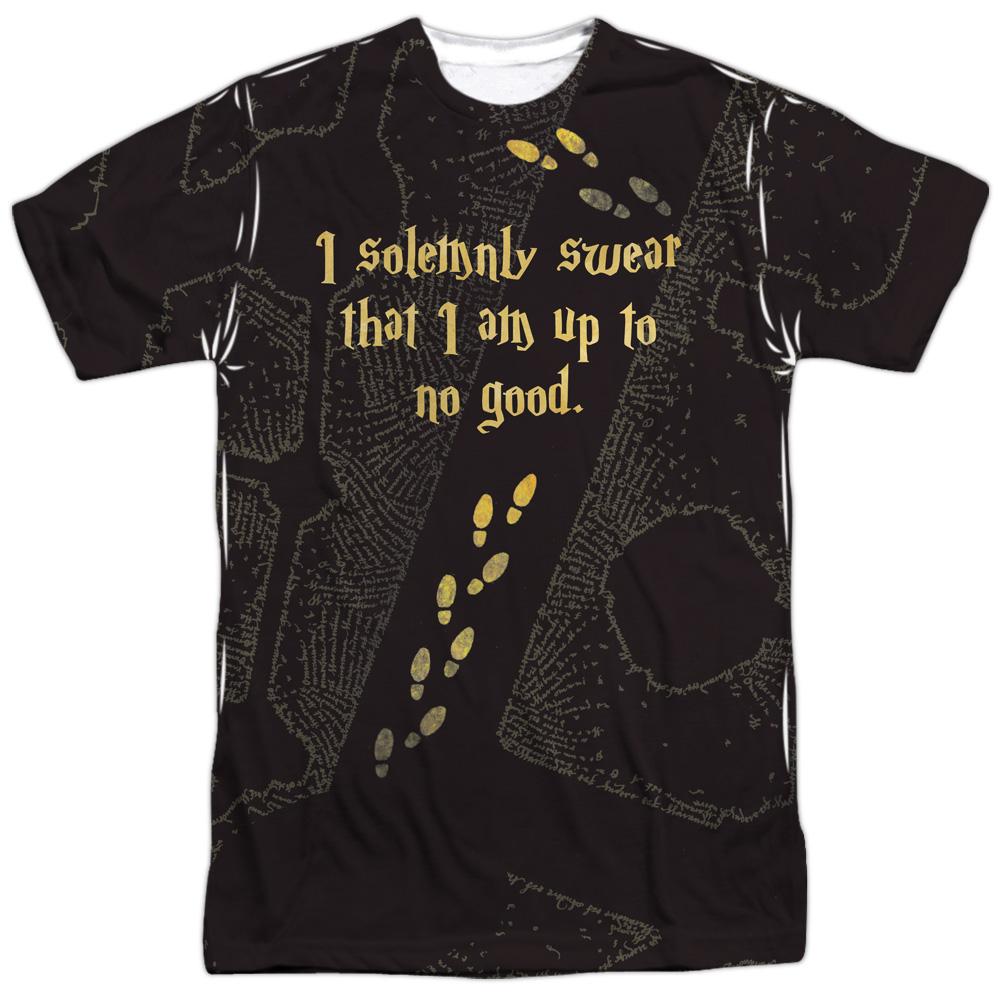 This sublimated t-shirt features a design of the Marauder's Map. This t-shirt is hand-printed using a dye sublimation printing process that creates slight imperfections over seams and/or folds and are unique to and a part of each t-shirt. 100% polyester.