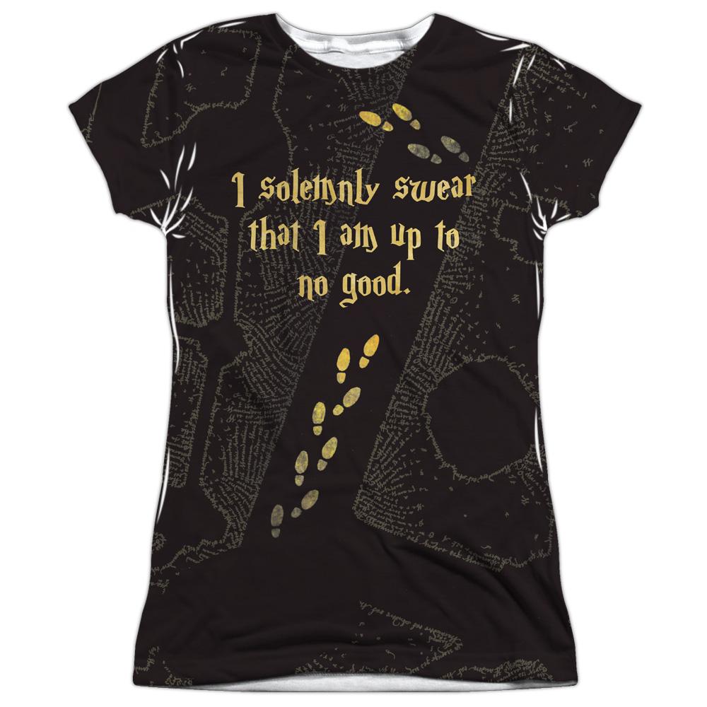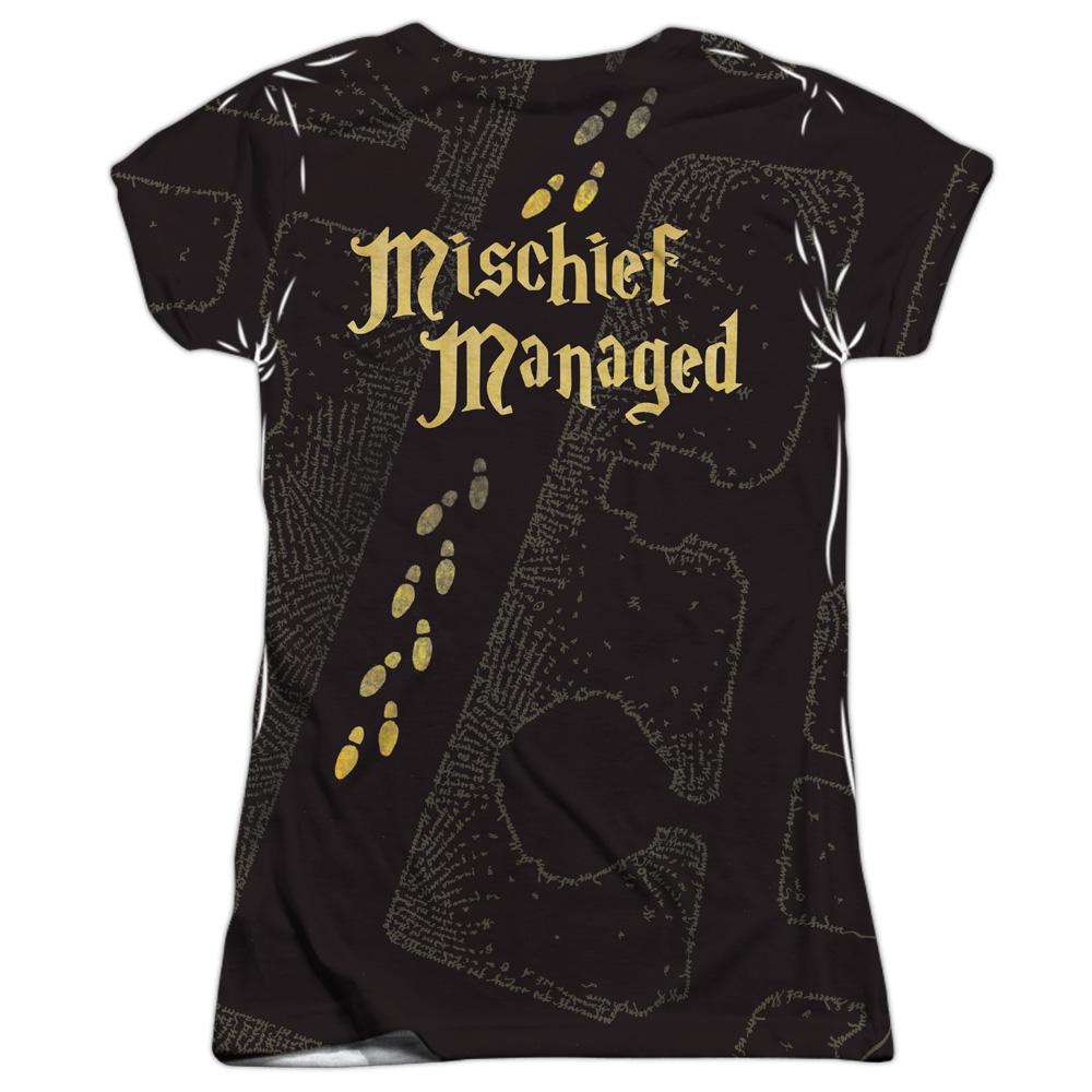This sublimated juniors t-shirt features a design of the Marauder's Map. This juniors t-shirt is hand-printed using a dye sublimation printing process that creates slight imperfections over seams and/or folds and are unique to and a part of each t-shirt. 100% polyester.