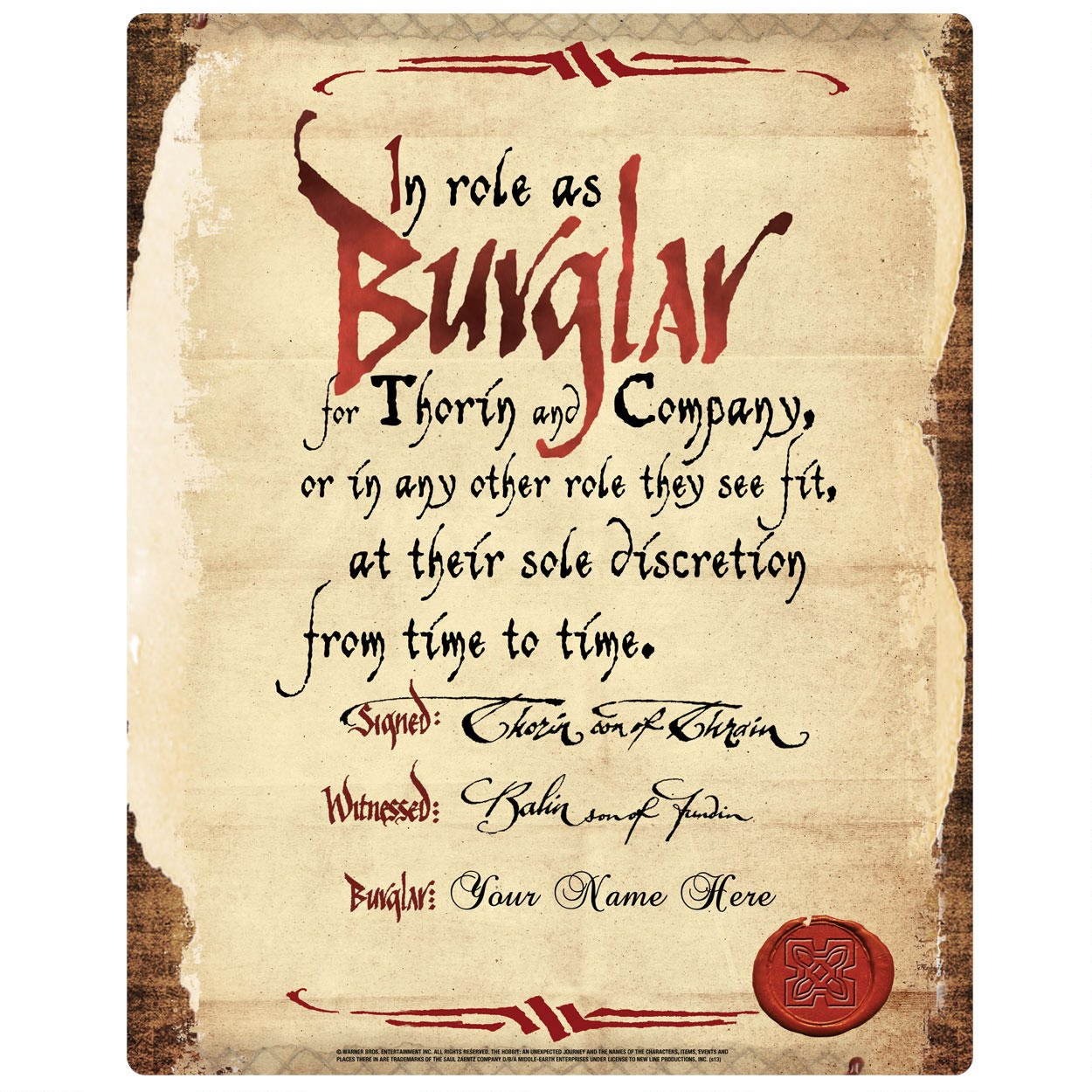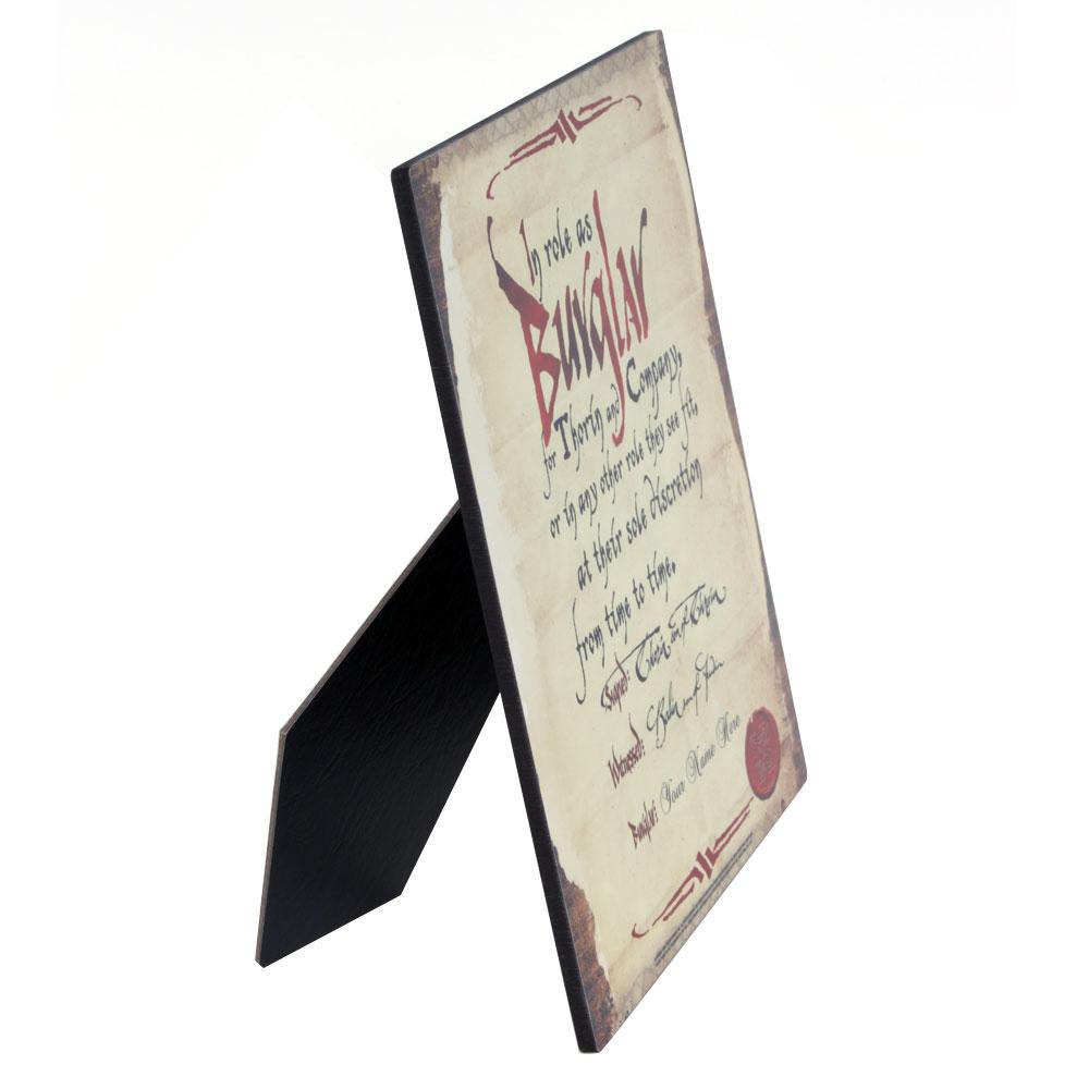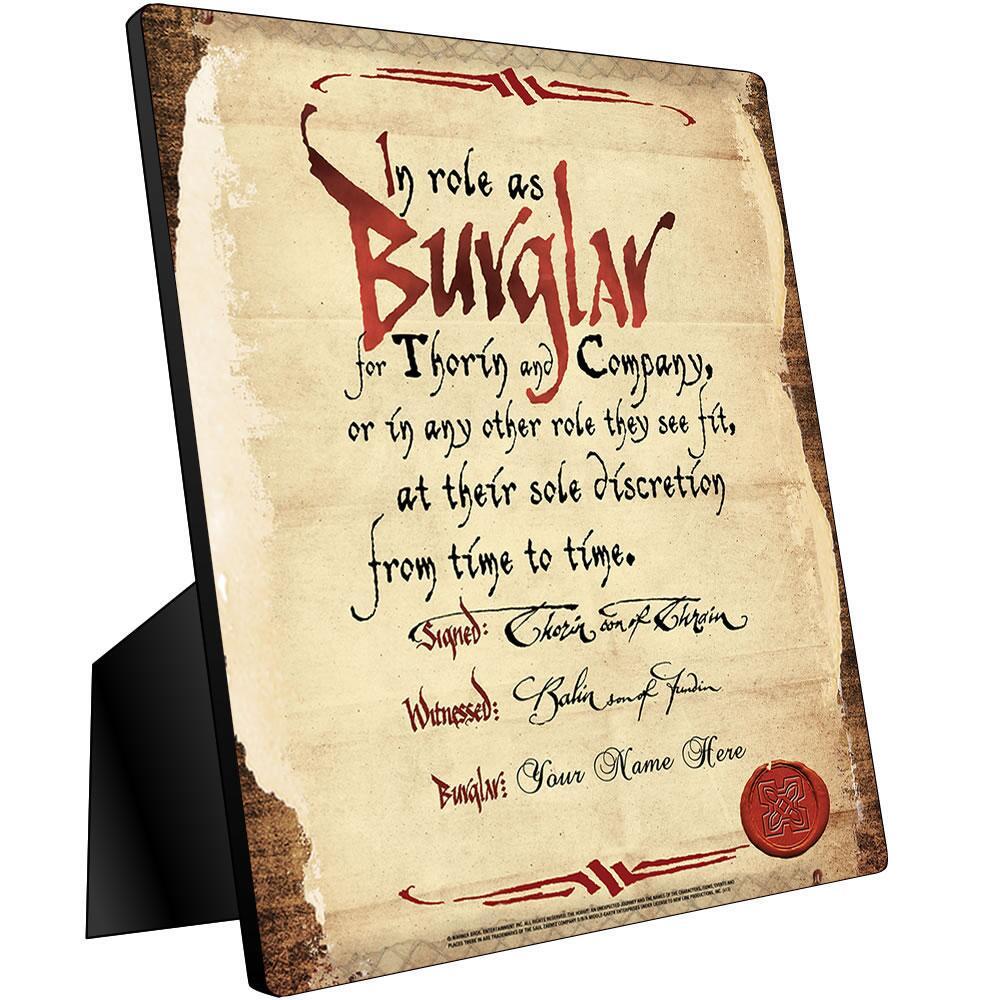Exclusively ours, this personalized Bilbo Baggins Burglar Contract is a fantastic gift for any fan of The Hobbit: An Unxpected Journey! (Read below for instructions on personalizing your contract.) This contract is a short version of the extremely long agreement signed by Bilbo Baggins in the movie, printed with your very own name. Featuring the the stylish script and colors from that document, signed by Thorin and witnessed by Balin, it is available in the full 8" x 10" size, and a smaller, compact 5 x 7 size. Printed on 1/4 inch thick Chromaluxe panels that don't require any framing, these replicas are highly resistant to ultraviolet rays, scuffs, scratches, water, and fading. The panels include an attached easel so they can stand on any desk, shelf, or night table.