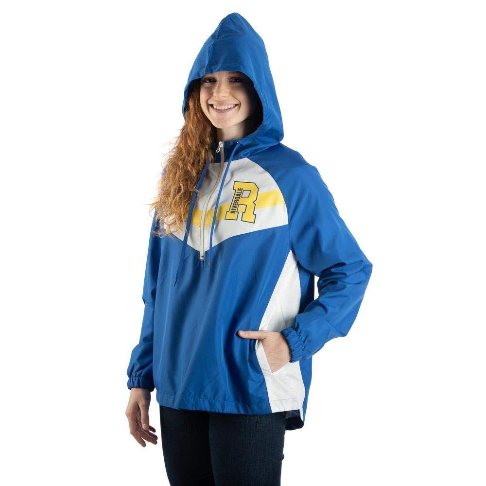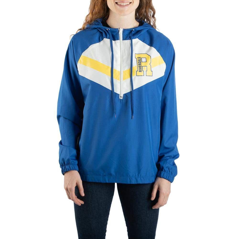 Show loyalty to your favorite high school with this Riverdale inspired windbreaker jacket. This is a half-zip windbreaker jacket in the blue and yellow of the River Vixens. It features the Riverdale "R" embroidered on the left-hand chest side in yellow and has two side pockets on the front. 100% polyester