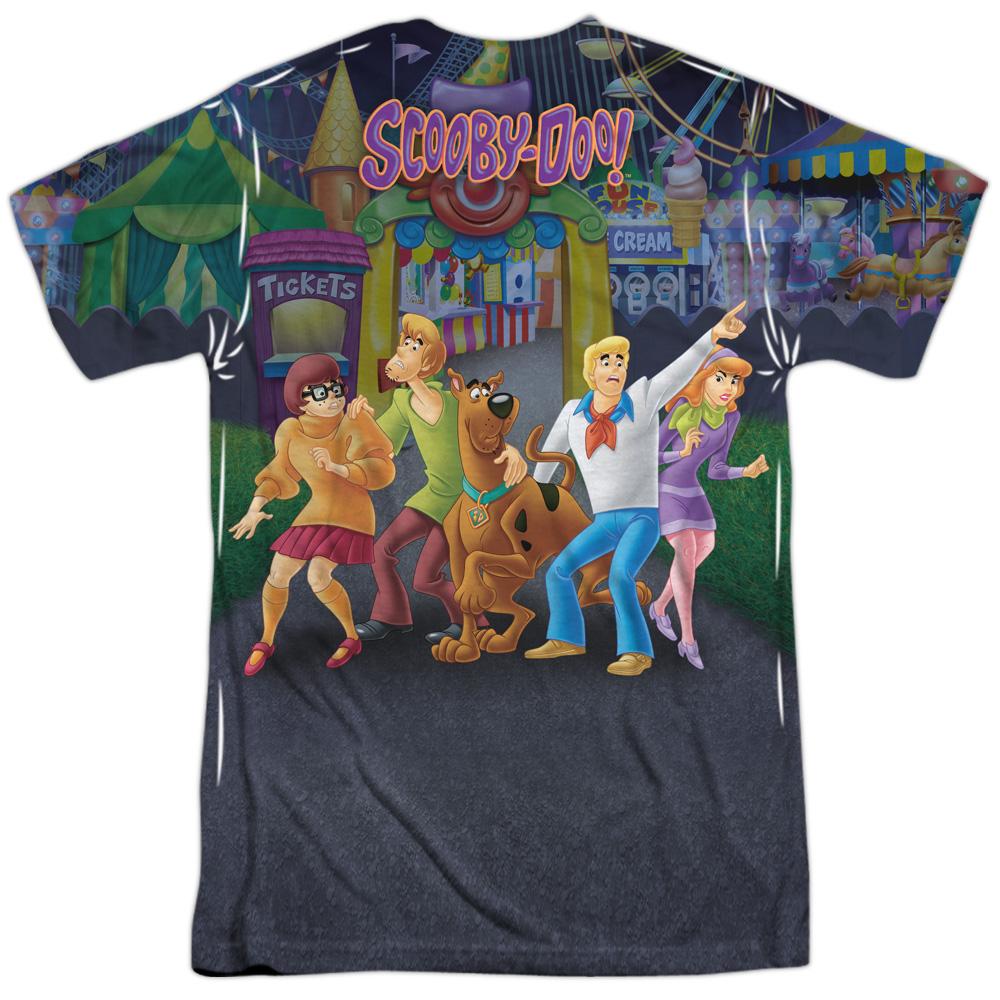 This sublimated t-shirt features a design of Scooby on the front and the gang on the back. This t-shirt is hand-printed using a dye sublimation printing process that creates slight imperfections over seams and/or folds and are unique to and a part of each t-shirt. 100% polyester.