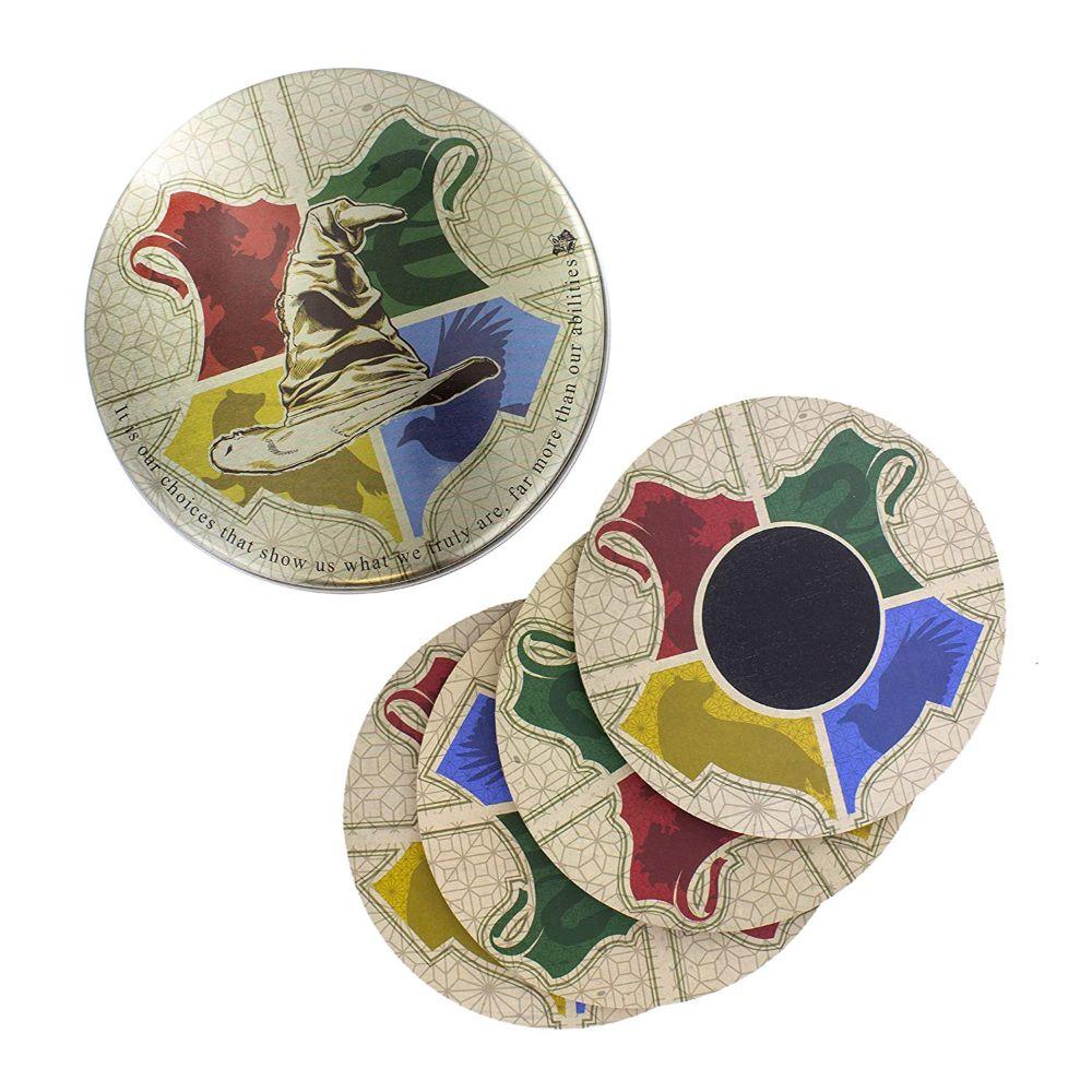 Bring a little Hogwarts magic home with this set of four laminated, hardboard, heat change coasters and find out which Hogwarts house the magical Sorting Hat picks for you. Simply place a hot drink on a coaster and see the center change into a Hogwarts house icon! Makes a great gift for any witch or wizard who loves the Wizarding World.