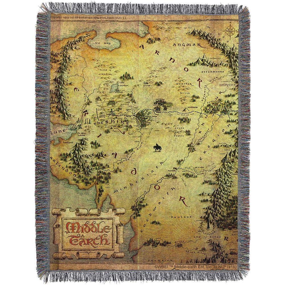 Use this beautiful The Hobbit: An Unexpected Journey Map of Middle-earth woven tapestry throw blanket as a room accent, bed covering, throw blanket or wall hanging. Crafted with amazing color and detail, this conversation piece is sure to delight. Measuring 48" x 60," the throw is fringed on all four ends.
