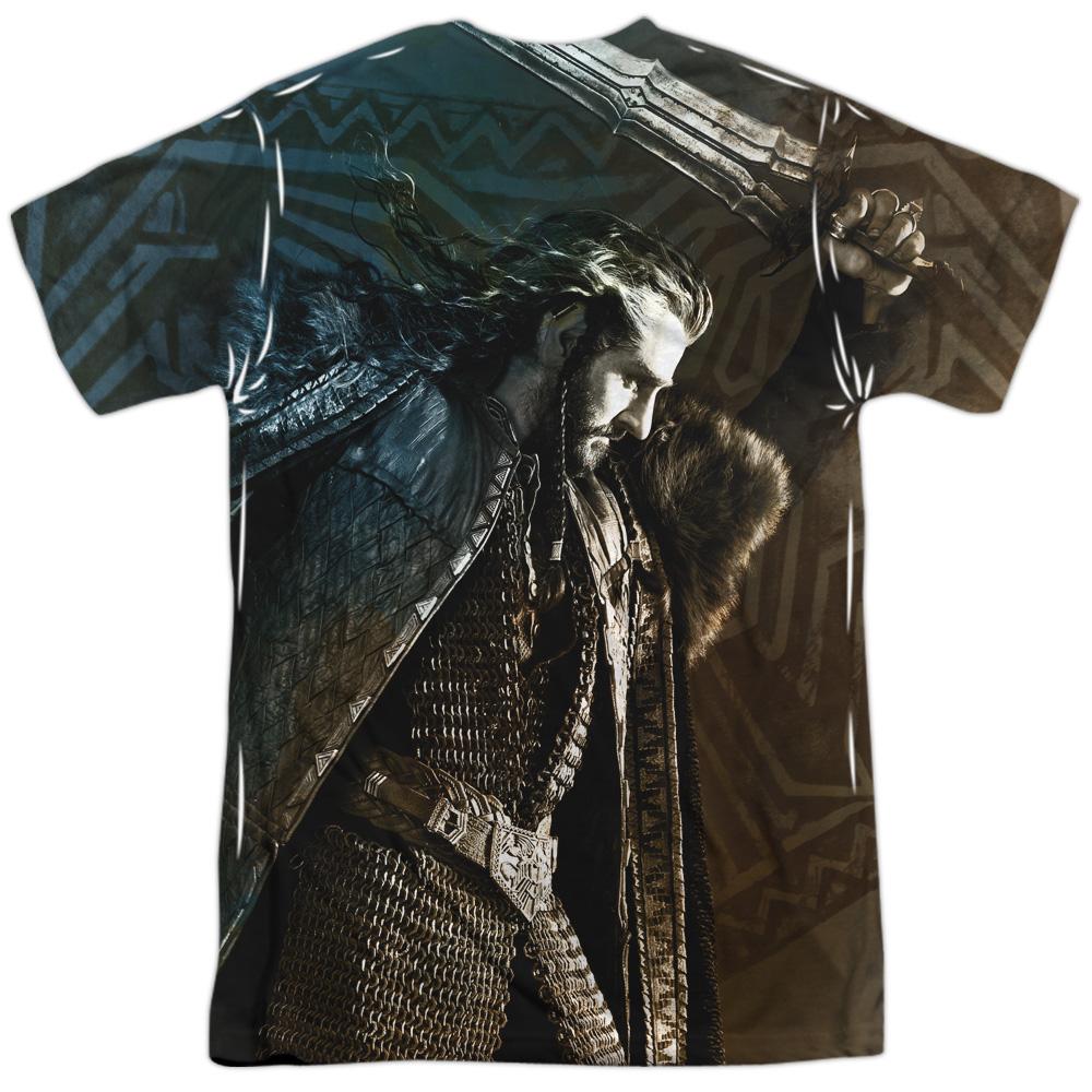 This sublimated t-shirt features a design of Thorin Oakenshield on the front and back and the text reading "The King under the Mountain" on the front. This t-shirt is hand-printed using a dye sublimation printing process that creates slight imperfections over seams and/or folds and are unique to and a part of each t-shirt. 100% polyester.
